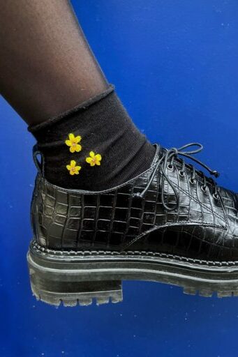 Nos chaussettes brodées sont une taille unique femme, arrivent à hauteur de la cheville et ont les bords roulés pour ne pas marquer la peau.