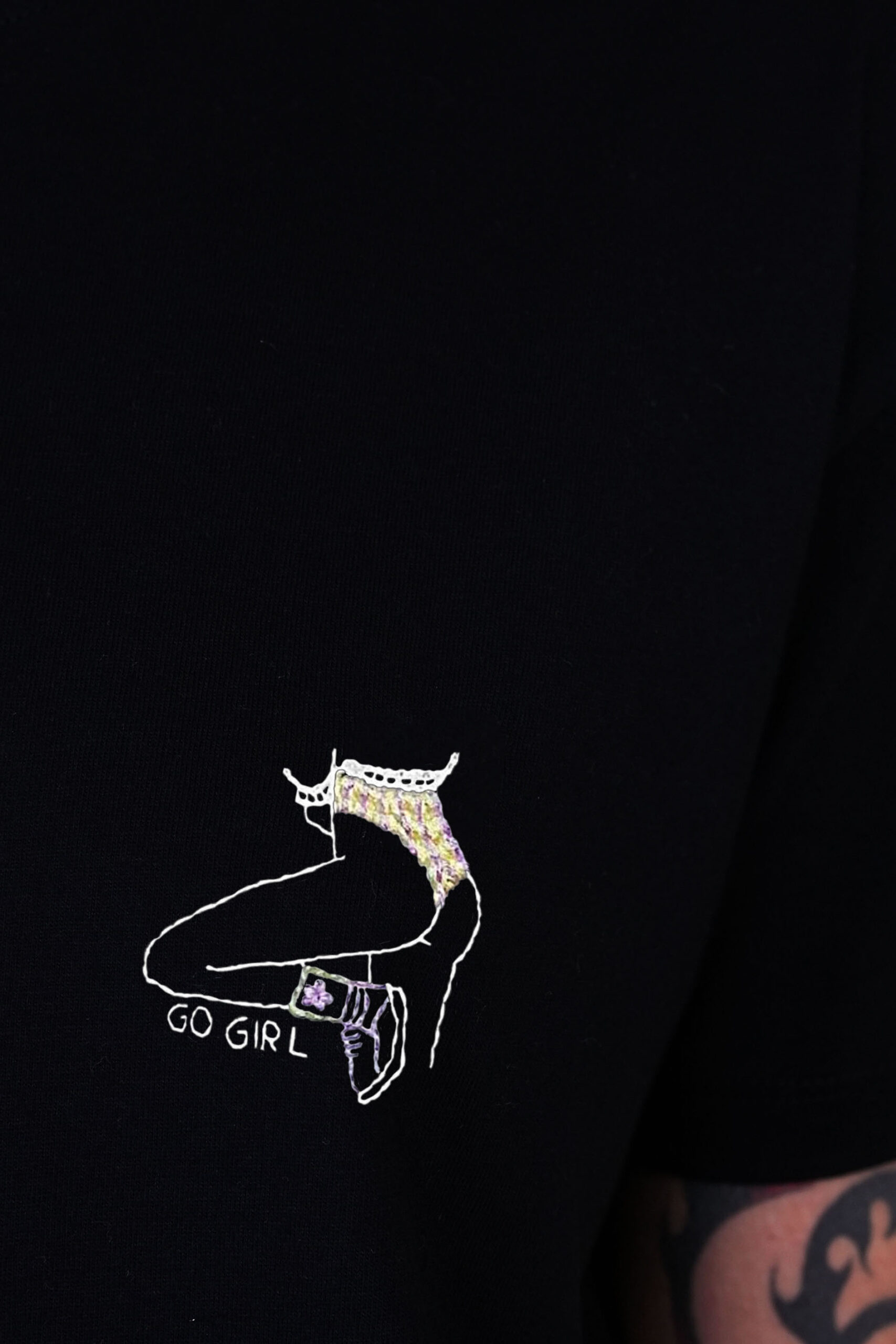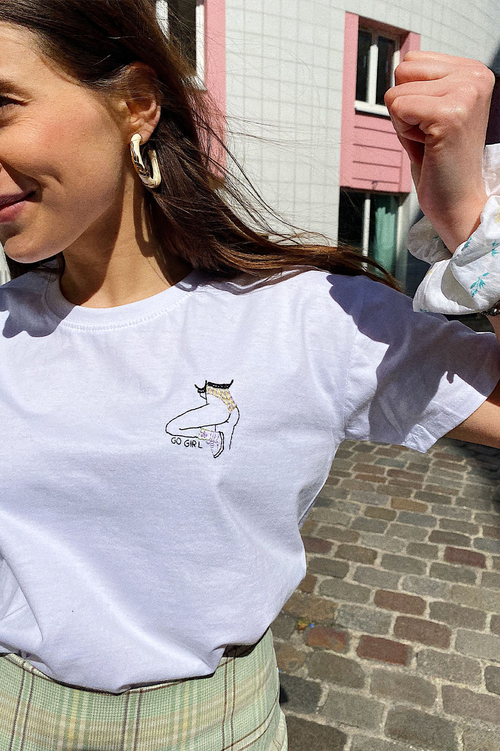 Célébrez la confiance en soi et l’empowerment des femmes avec notre T-shirt brodé  à la main « Go Girl”, une pièce unique confectionnée avec amour. Sélectionné pour sa douceur et sa coupe unisexe parfaite, notre t-shirt 100% coton est brodé à la main dans notre atelier parisien, avec patience et savoir-faire. Il allie parfaitement le confort du t-shirt avec le style original de la broderie!