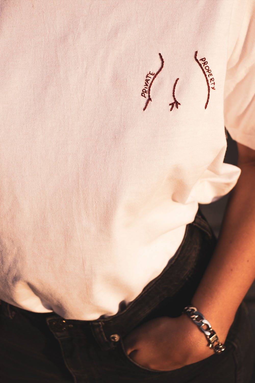 Exprimez votre engagement féministe avec humour et style grâce à notre T-shirt brodé « Private Property », une pièce unique confectionnée avec amour. Sélectionné pour sa douceur et sa coupe unisexe parfaite, notre t-shirt 100% coton est brodé à la main dans notre atelier parisien, avec patience et savoir-faire. Il allie parfaitement le confort du t-shirt avec le style original de la broderie !