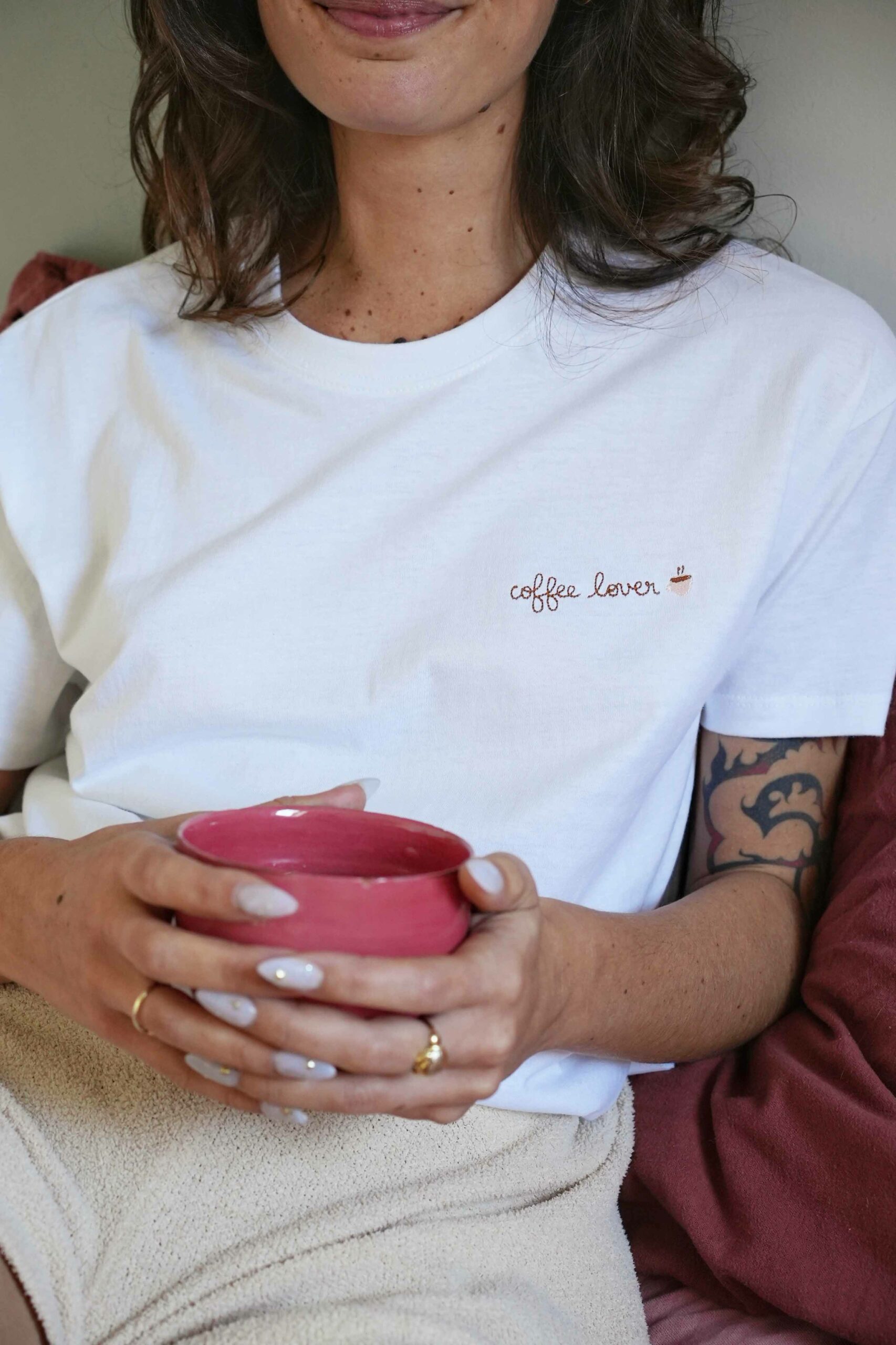 Réveillez-vous avec une tasse de café et déclarez lui votre amour avec notre T-shirt brodé « Coffee Lover », une pièce unique alliant parfaitement le confort du t-shirt avec le style original de la broderie. Sélectionné pour sa douceur et sa coupe unisexe parfaite,  notre t-shirt 100% coton est brodé dans notre atelier parisien, avec amour et patience. Offrez-vous un vêtement unique et intemporel qui raconte une histoire.